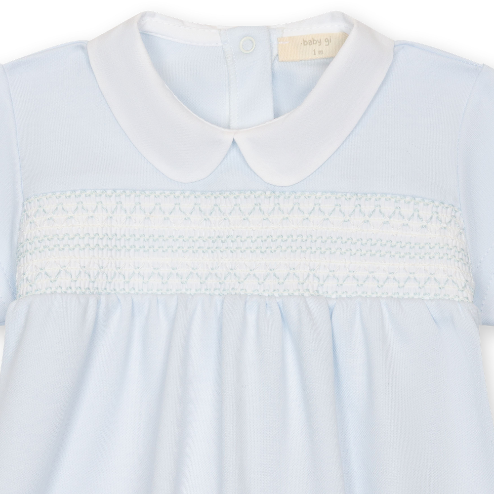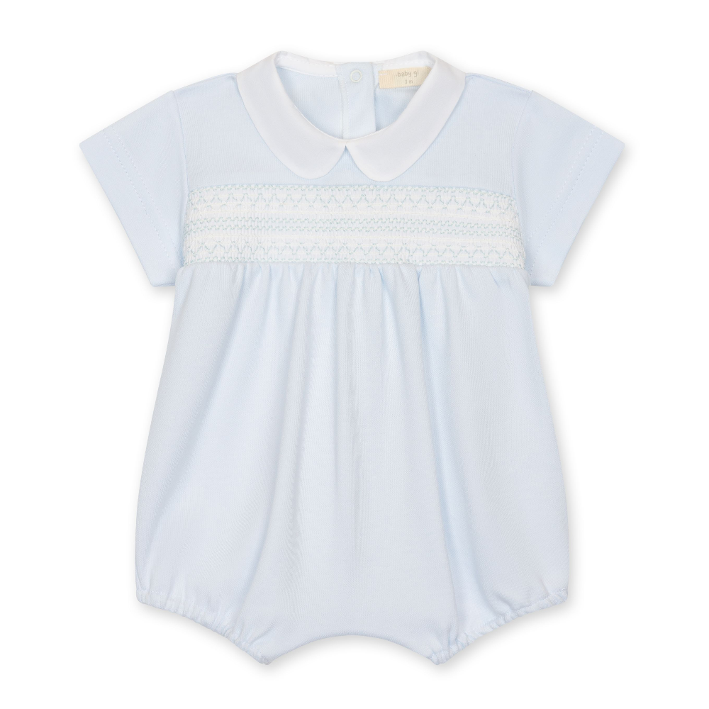 Blue cotton romper with a white smocking to chest.