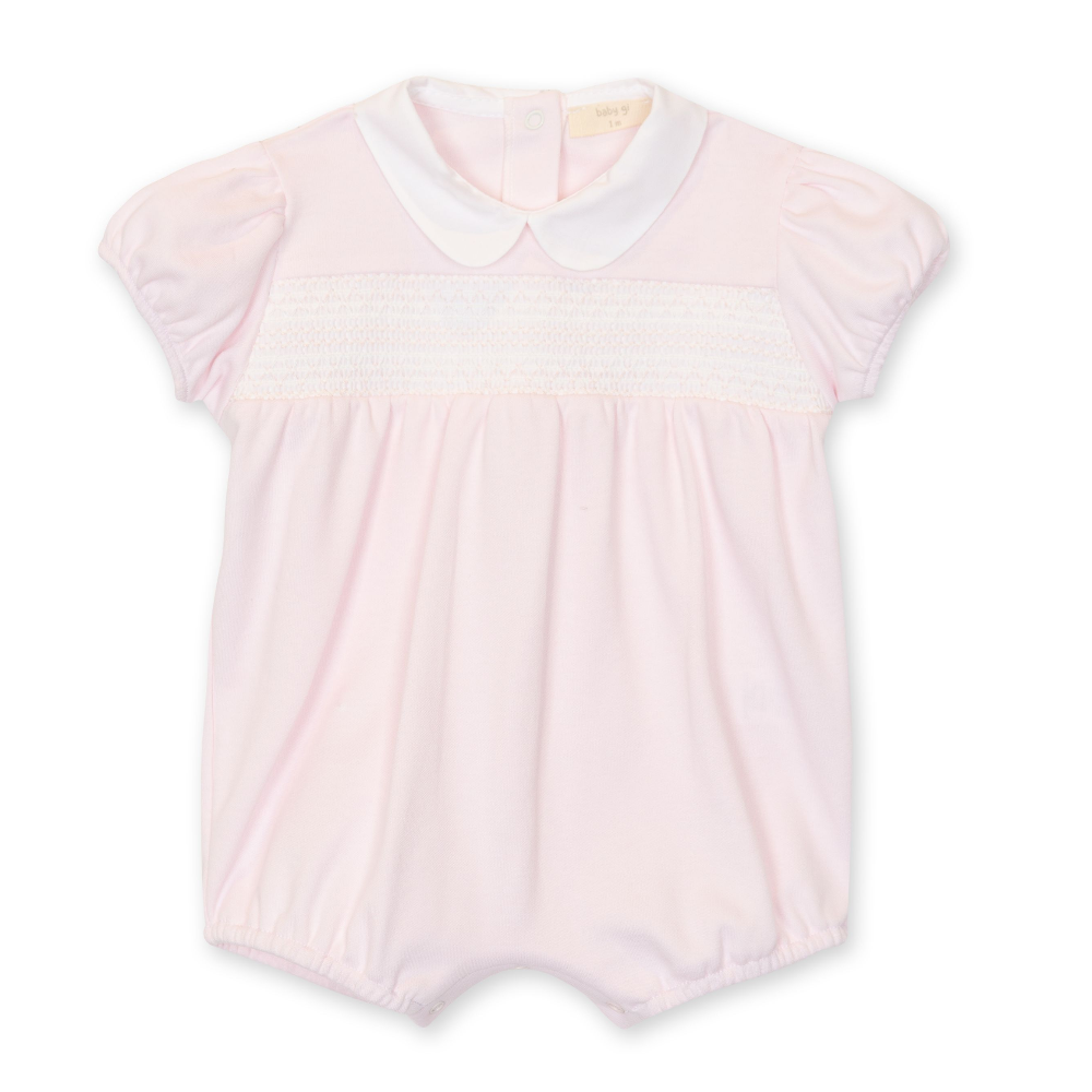 Pink cotton romper with a white smocking to chest.