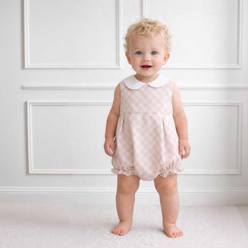 New In Fofettes x Be Chic Beige Check Romper - Pre Order - 3 month is backordered and will ship as soon as it is back in stock.