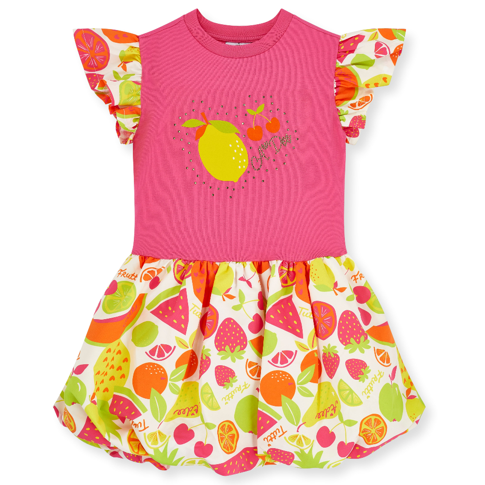 The Tilly dress features a pink soft jersey top with a fruit artwork on the front and frilly fruit print sleeves, finished with a puff fruit print skirt.