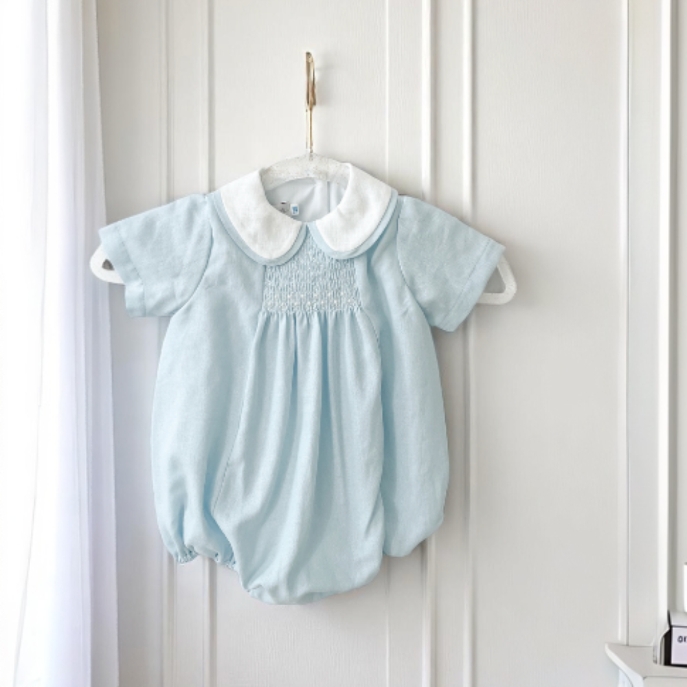 New In Fofettes Boys Blue Linen Smocked Romper - 3 month is backordered and will ship as soon as it is back in stock.