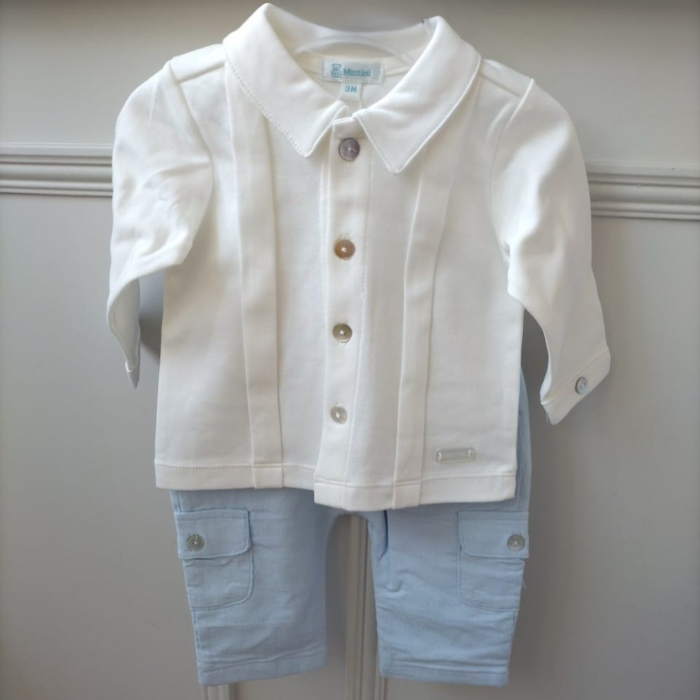 New In Mintini Boys Blue 2 Piece Trouser Set - 3 month is backordered and will ship as soon as it is back in stock.