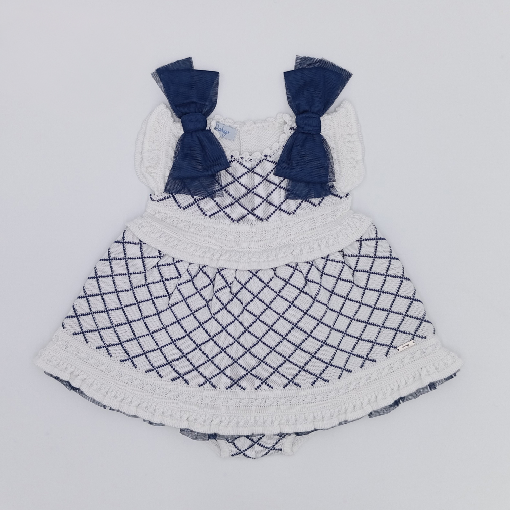 Stunning white baby dress with navy criss cross pattern and matching knickers.