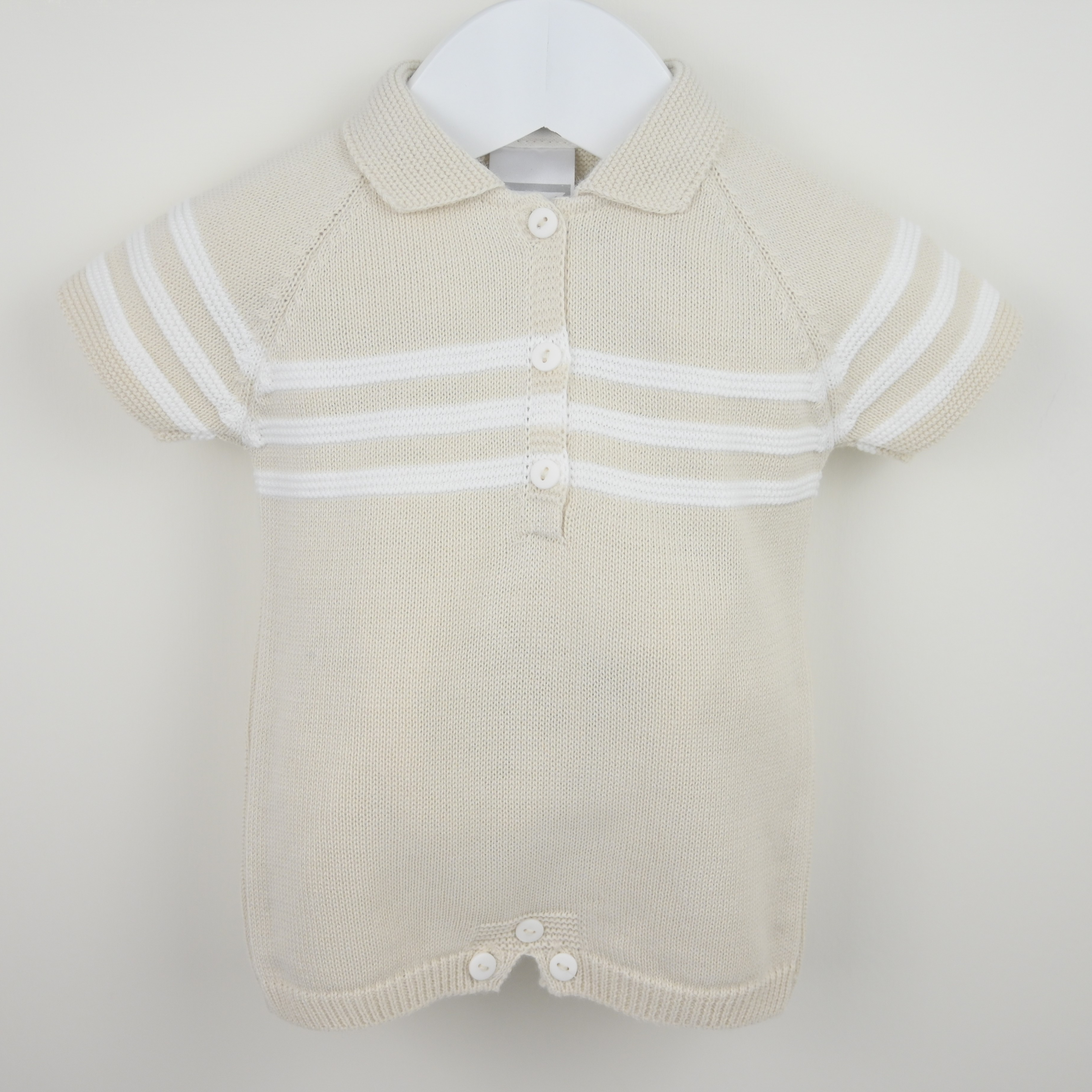 Beige boys romper with white stripes across the chest and collar and buttons to front.