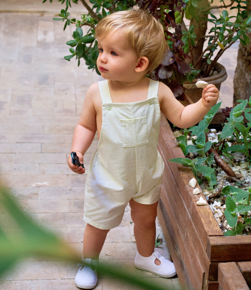 Striped short dungarees with a green & white stripe.