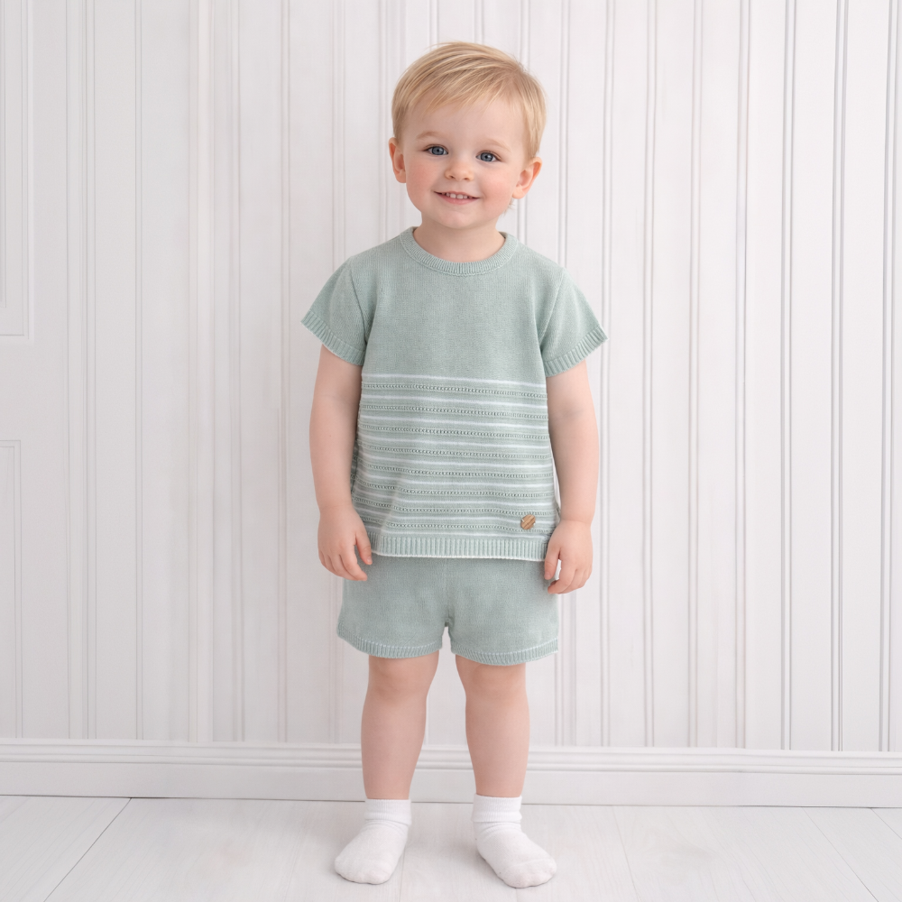Stunning boys fine knit sage and white shorts set.
