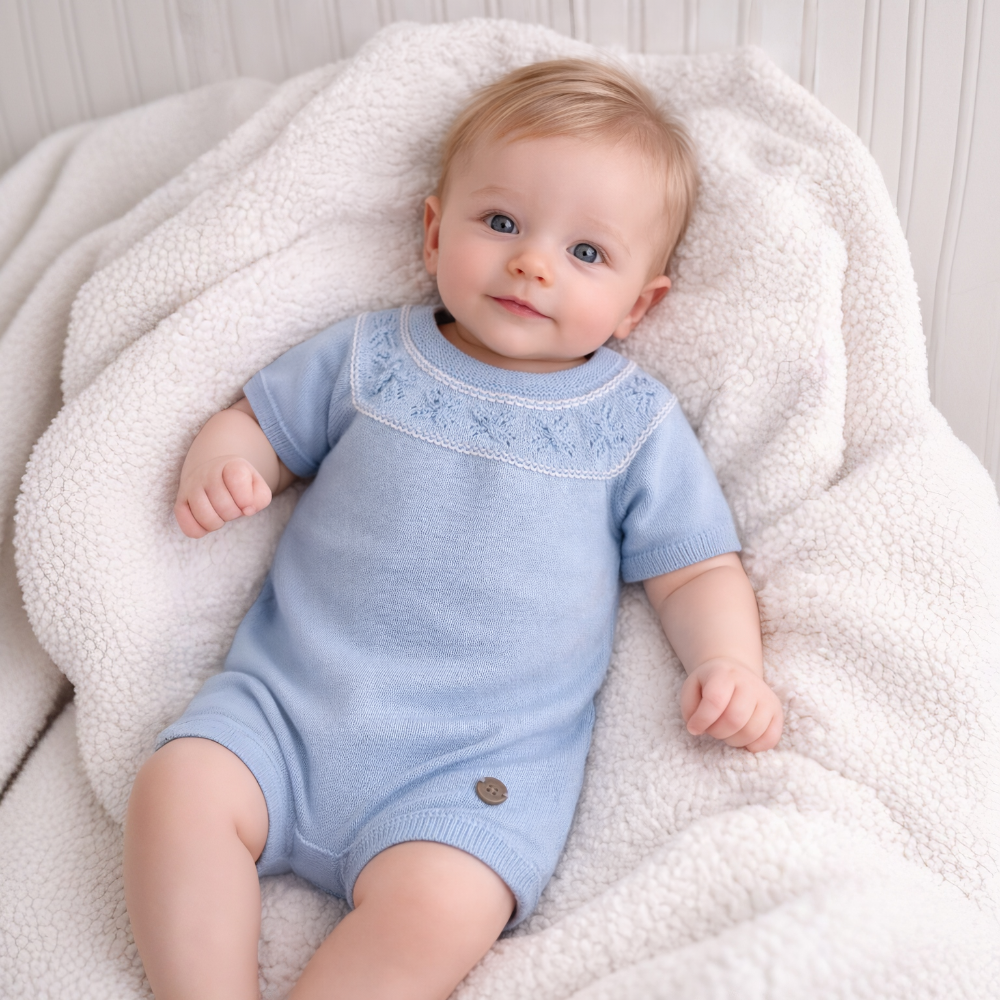 New In Artesania Granlei Blue & White Knitted Romper - 1 month is backordered and will ship as soon as it is back in stock.
