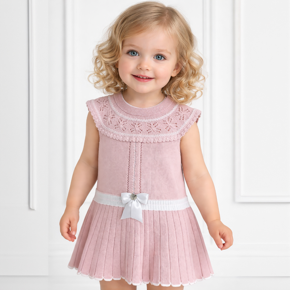 The dress is knitted with ribbon running down the front of it and a bow at the bottom.