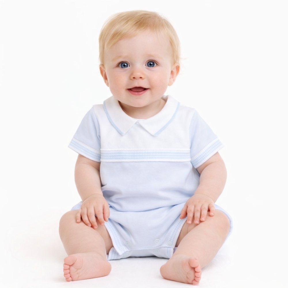 Boys Deolinda Marshmallow white & blue romper.