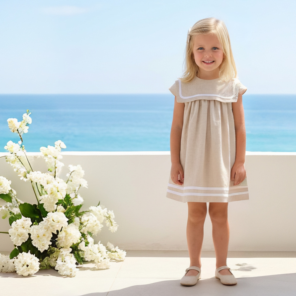 New In Fofettes x Be Chic Girls Beige Linen Sailor Dress - Pre Order - 12 month is backordered and will ship as soon as it is back in stock.