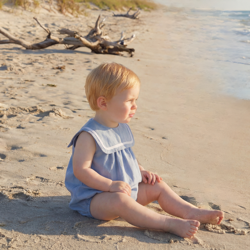 New In Fofettes x Be Chic Boys Blue Sailor Romper - Pre Order - 3 month is backordered and will ship as soon as it is back in stock.