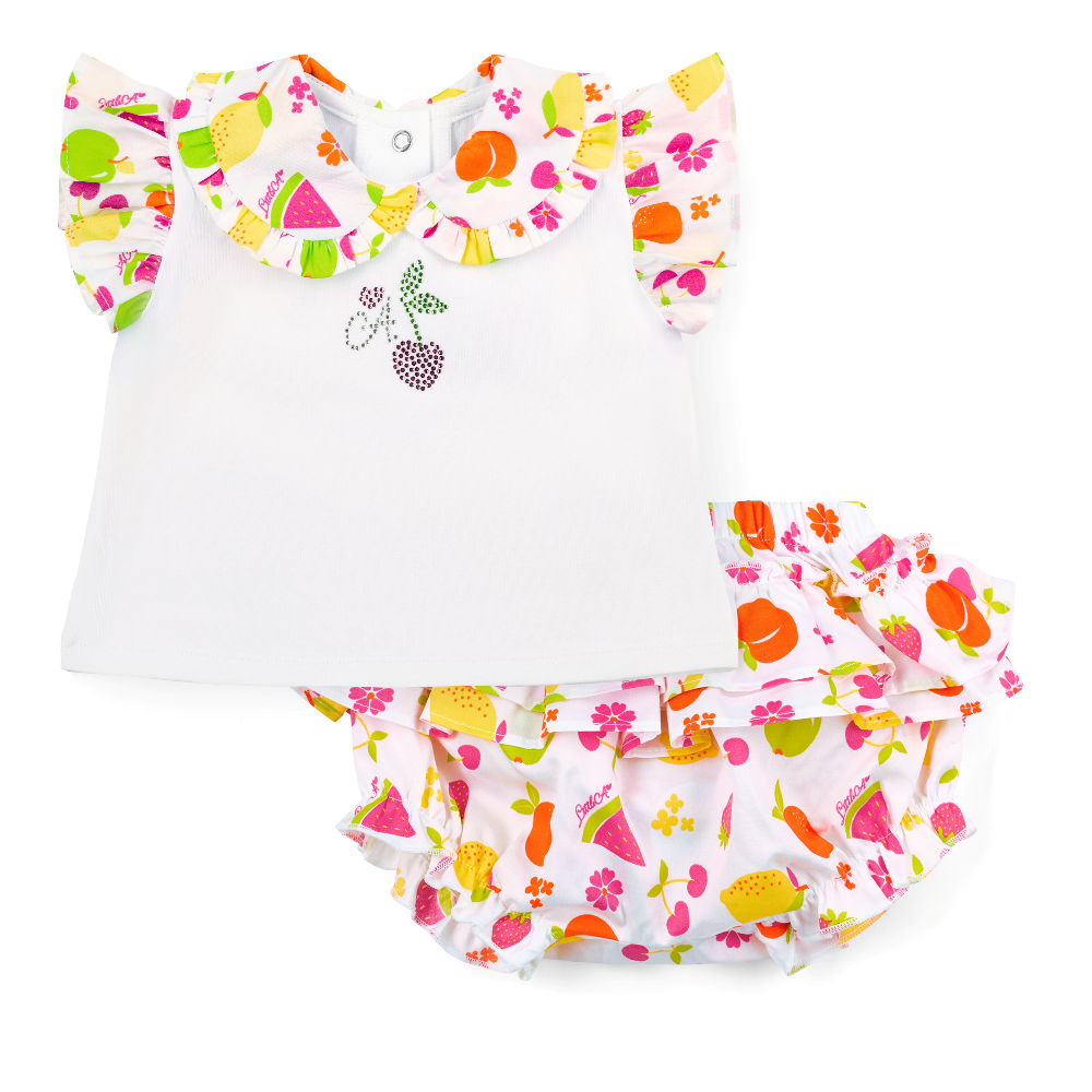 Perfectly paired with fruit print frilly pants, finished with an applique bow at the back.